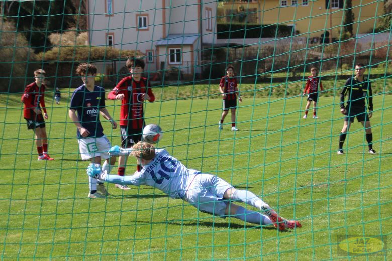 Elfmeter gegen uns. Einen davon konnte unser Tormann Toni Hauser mit einer starken Parade entschärfen und seine Mannschaft im Spiel halten.